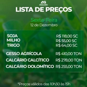 Cotação Agrícola para esta Sexta-feira 11 de Dezembro de 2025.